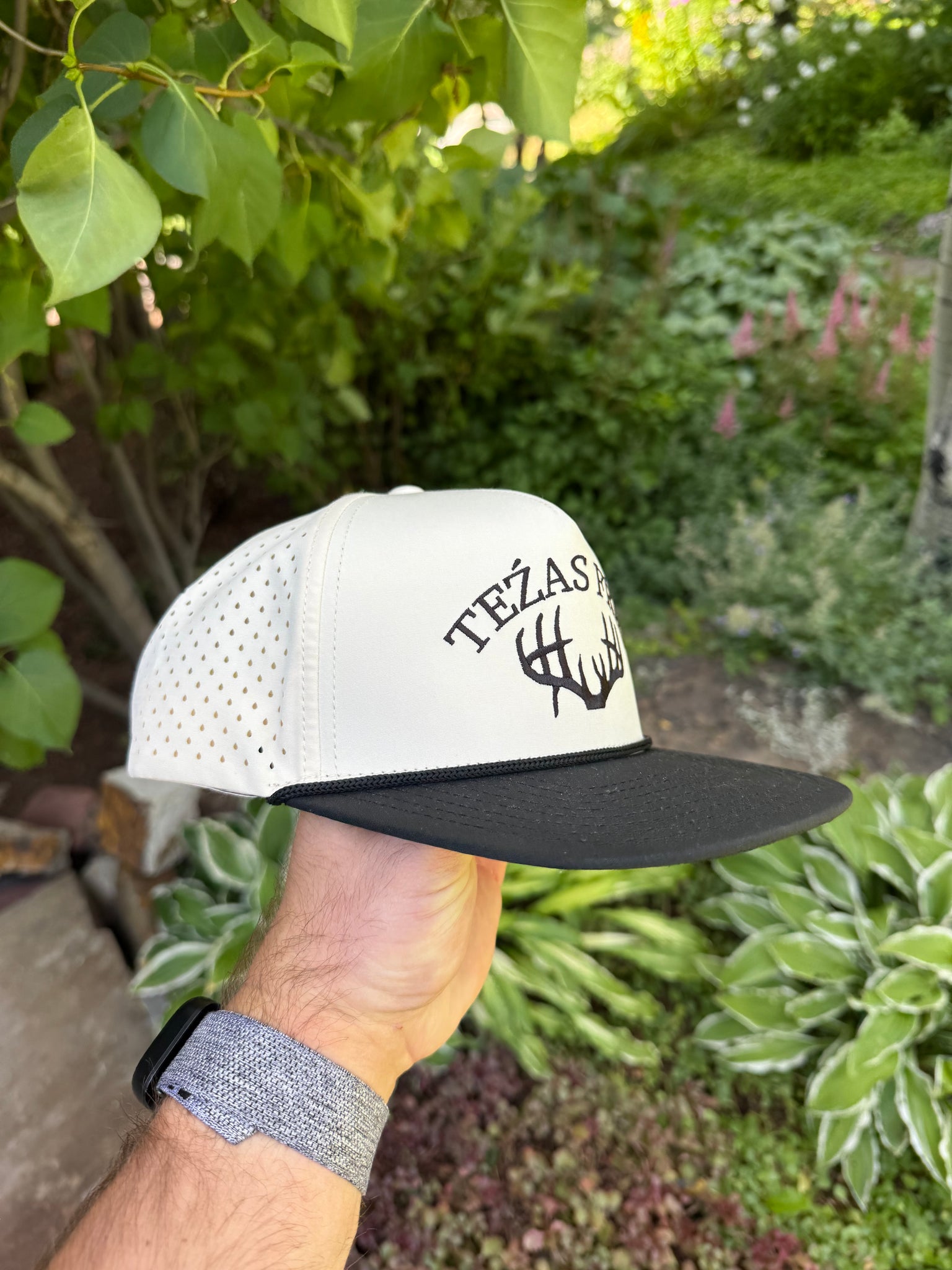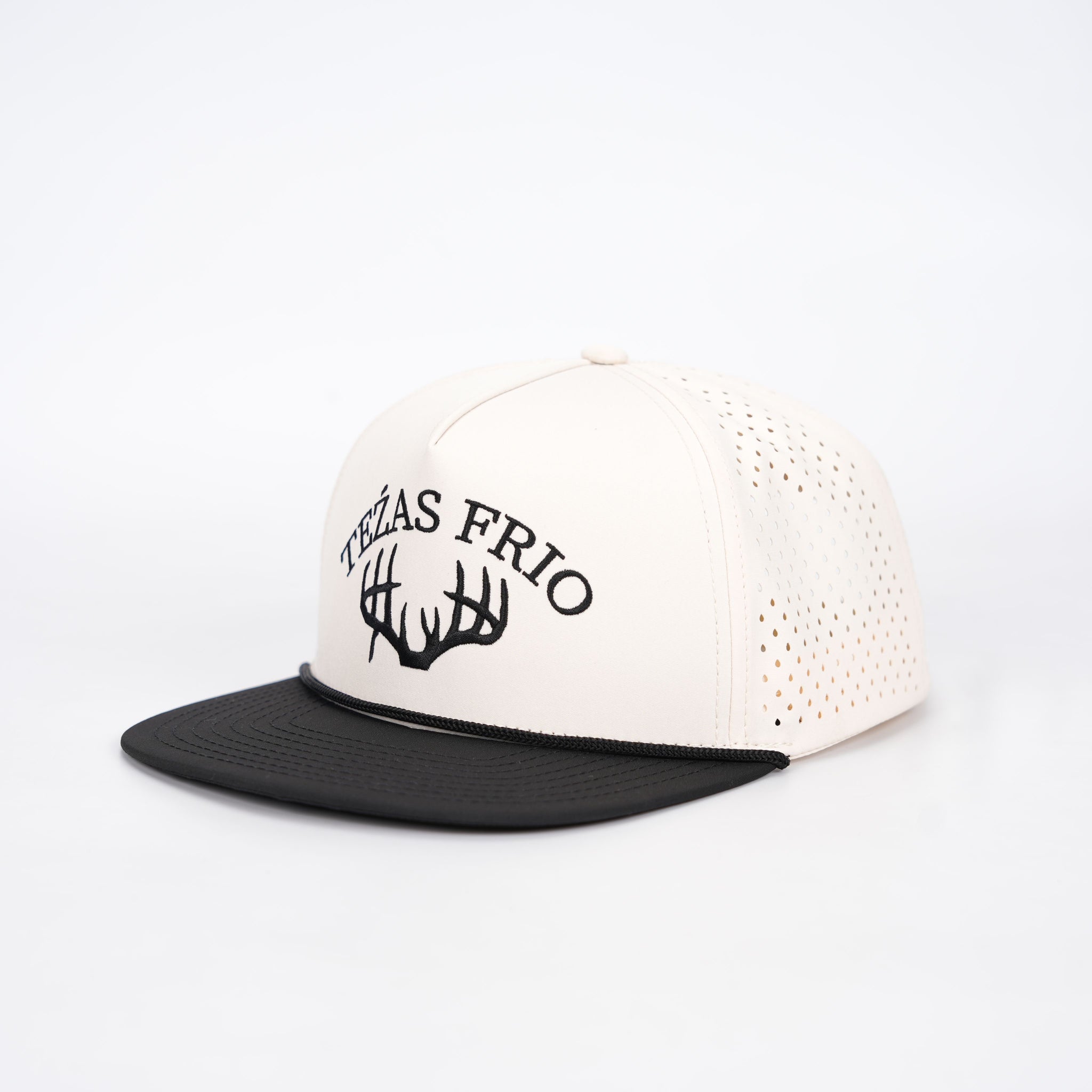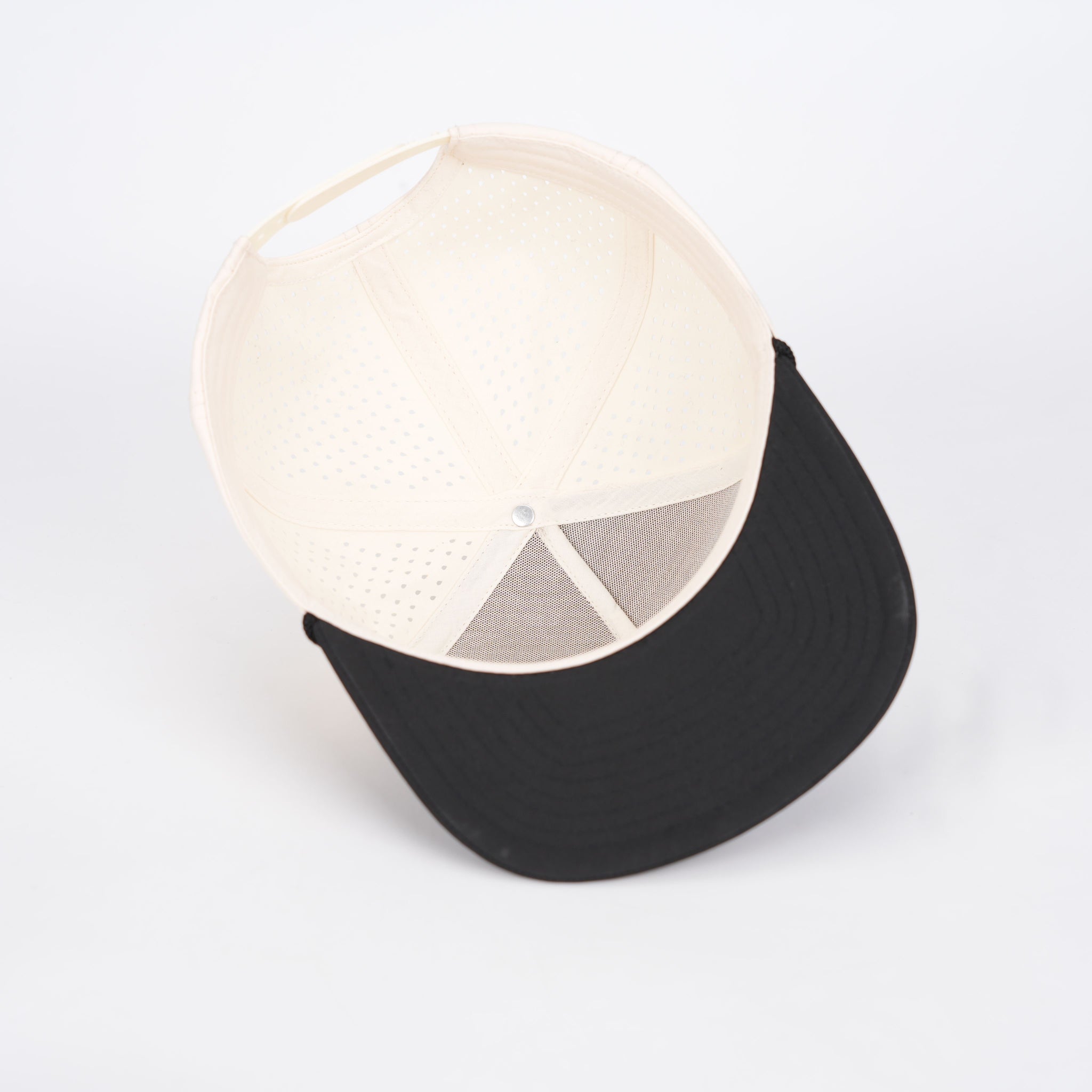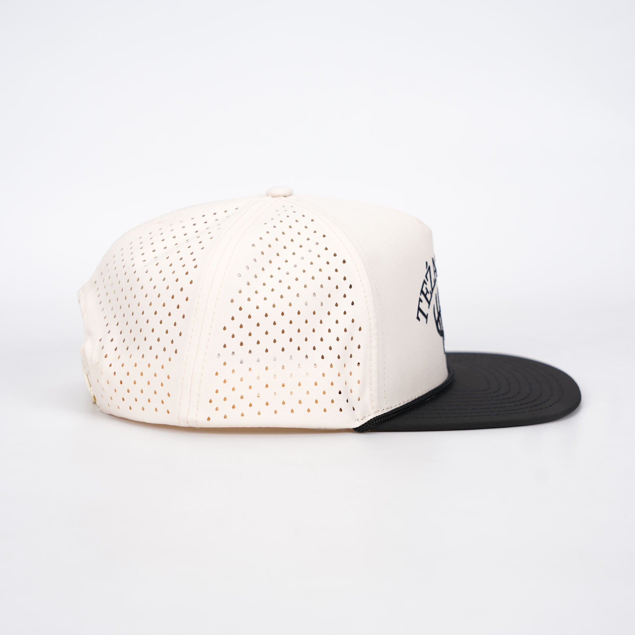 Waterproof SnapBack with laser cut holes. Tan body w/black thread, black bill and black rope