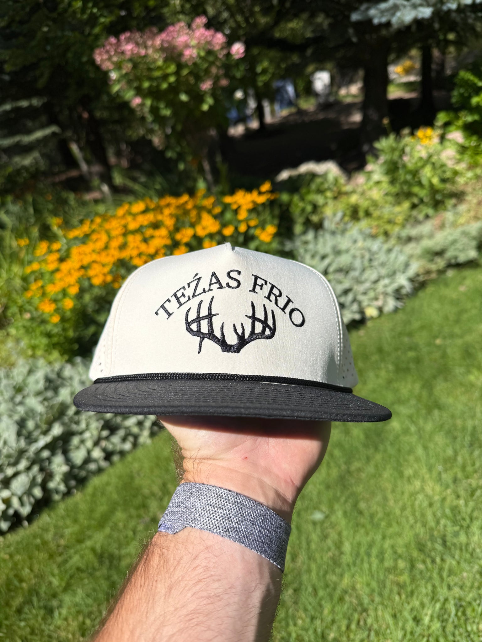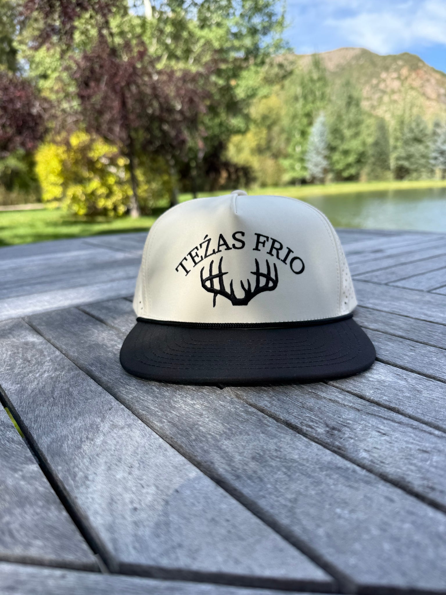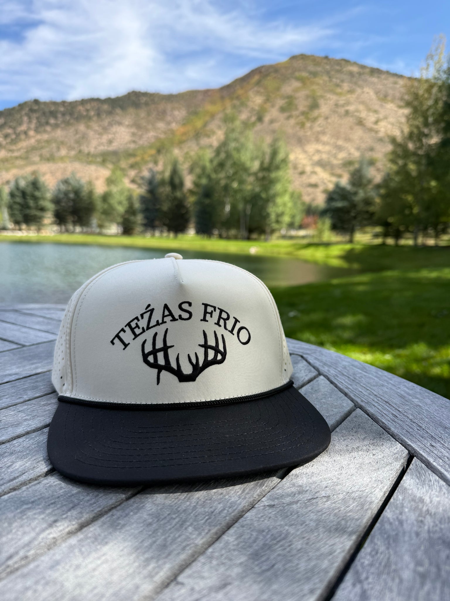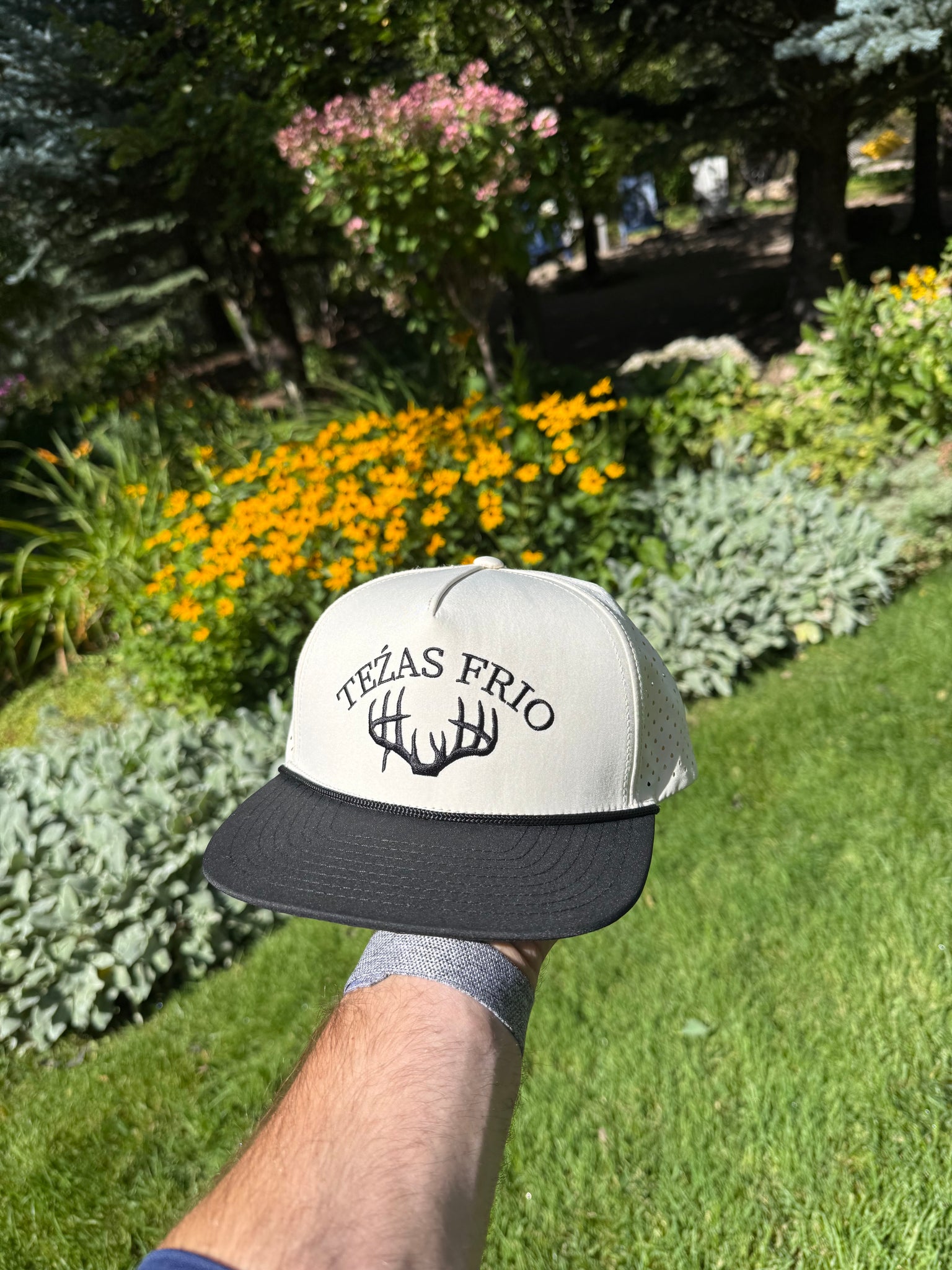Waterproof SnapBack with laser cut holes. Tan body w/black thread, black bill and black rope