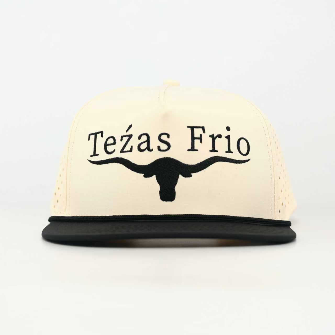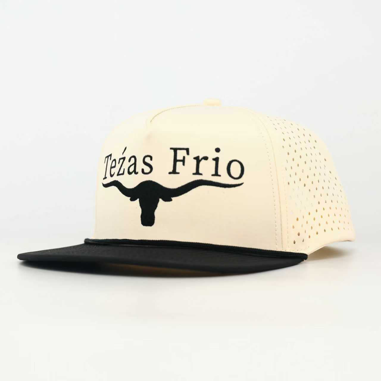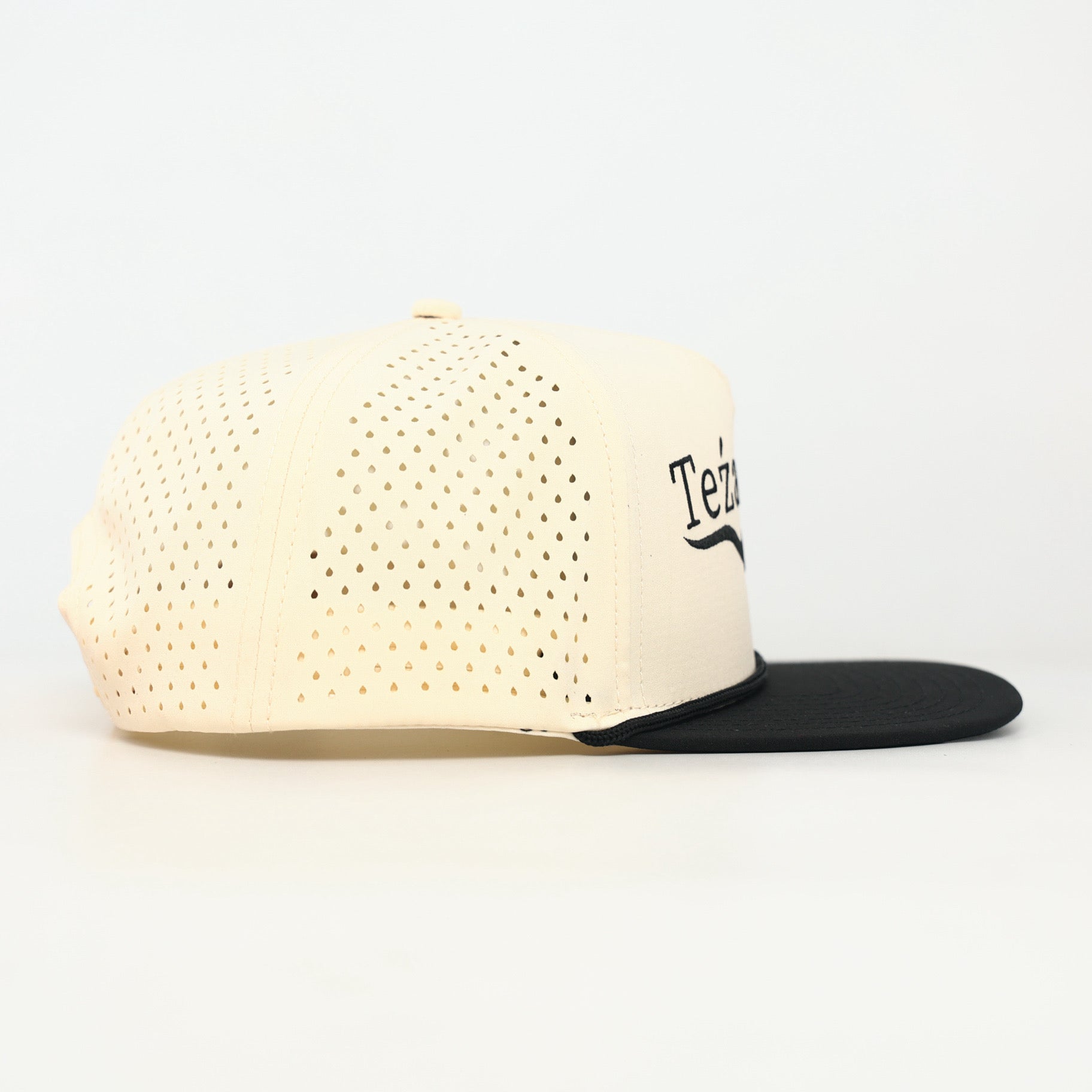 Tan hat with black bill, black thread and black rope. waterproof, laser cut perforated holes, SnapBack, OSFM